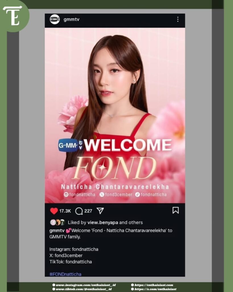 Pada Senin (10/11), melalui media sosial GMMTV kembali memperkenalkan artis barunya. Kali ini GMMTV memperkenalkan Fond Natticha Chantaravareelekha, mereka menuliskan keterangan, “Selamat datang Fond Natticha Chantaravareelekha di keluarga GMMTV.”