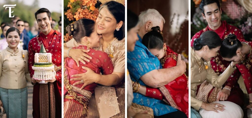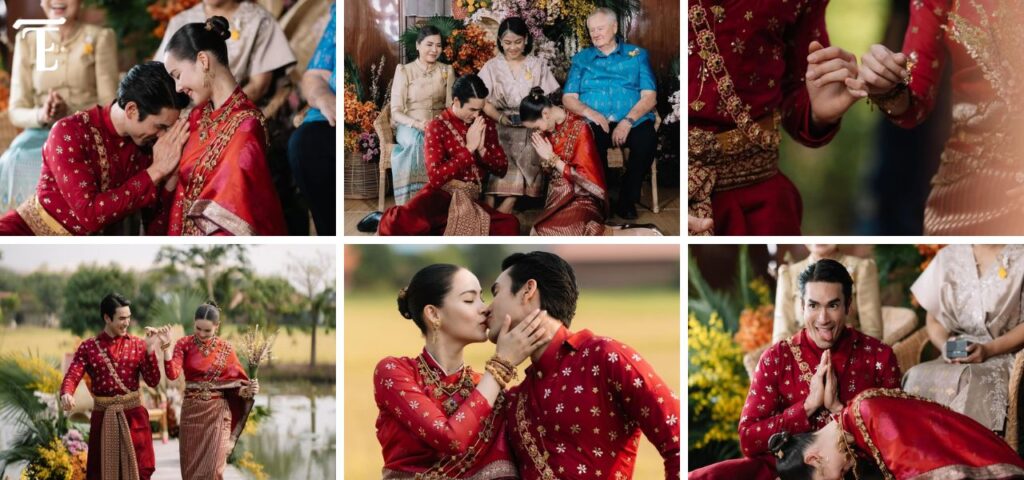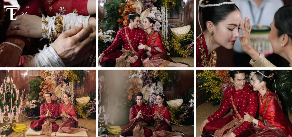 Keduanya terlihat serasi dalam balutan busana tradisional Thailand berwarna merah marun. Yaya terlihat anggun dengan sabai dan sanggul berhias emas, sedangkan Nadech tampil rupawan dengan balutan busana tradisional lengkap dan chong kraben.