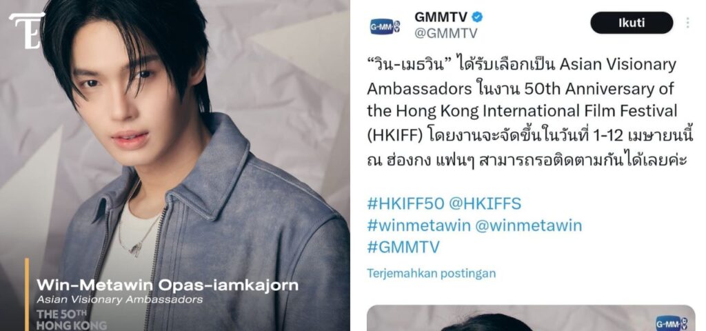 Hal tersebut diketahui melalui unggahan X (Twitter) GMMTV pada Selasa (10/30), yang menuliskan, “Win Metawin terpilih sebagai Asian Visionary Ambassador’ dalam Hong Kong International Film Festival (HKIFF). Acara tersebut akan digelar pada 1-12 April di Hongkong. Para penggemar dapat menantikan dan mengikutinya.”